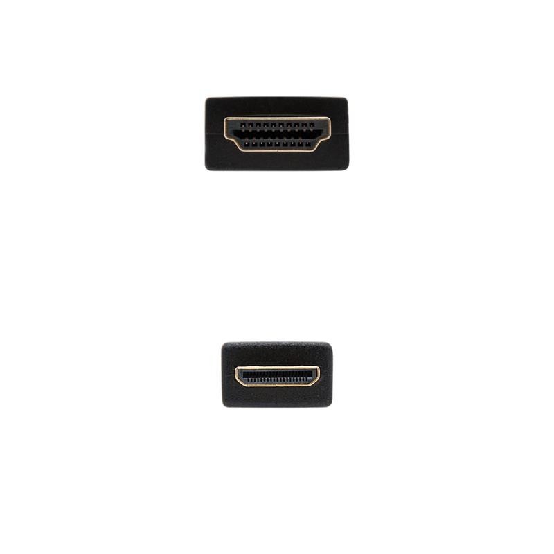 Nanocable CABLE HDMI A MINI HDMI V1.3, A/M-C/M, 1.8 M. Longitud de cable: 1,8 m, Conector 1: HDMI tipo A (Estándar), Género del conector 1: Macho, Conector 2: HDMI Type C (Mini), Género del conector 2: Macho, Contactos del conector chapado: Oro, Versión HDMI: 1.3b, Máxima resolución: 2560 x 1600 Pixeles, Color del producto: Negro - Cable HDMI V1.3b y full 1080P(categoría 2) de resolución tipo A macho en un extremo y tipo C macho(mini HDMI) en otro\n- Ancho de banda hasta 340MHz (10,2Gbps)\n- Conectores de alta calidad blindados en oro de 24K. M&&£acute;acute;ltiple apantallamiento formado por 128 hilos trenzados y lámina de aluminio para la máxima reducción de posibles interferencias. Fabricado con conductores de cobre (cobre OFC-Oxygen Free Copper- 99,99%) de alta calidad que garantiza la máxima calidad de transmisión.\n- Resolución en proyección digital WQXGA (2560 X 1600).\n- Tasas de refresco hasta 120Hz frame.\n- Soporta DOLBY True-HD y DTS-HD\n- 8 canales de descompresión de audio digital en tasa de 192KHz con 24bits.\n- Profundidad de color 24bits, 30bits, 25bits y 48bits\n- Soporta protección de contenido de alto ancho de banda digital