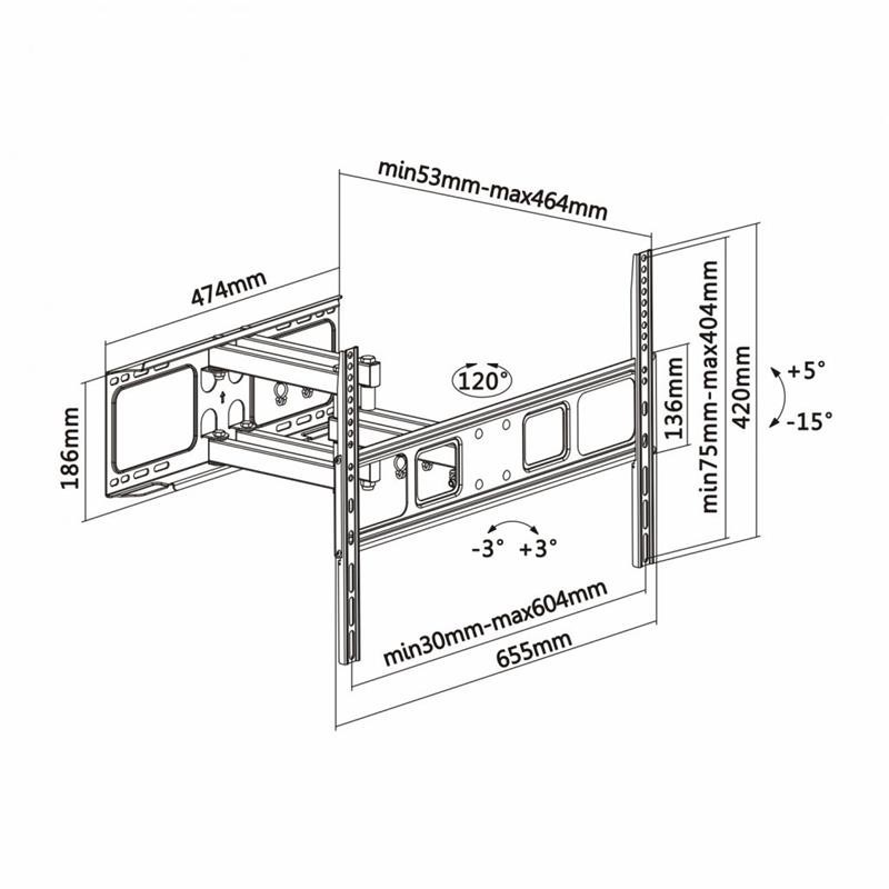 Distancia de la pared: ajustable entre 53 y 464 mm. Sistema de gestión de cables: dispone de unos ganchos para poder agrupar los cables. Manual de instrucciones multi idiomas.