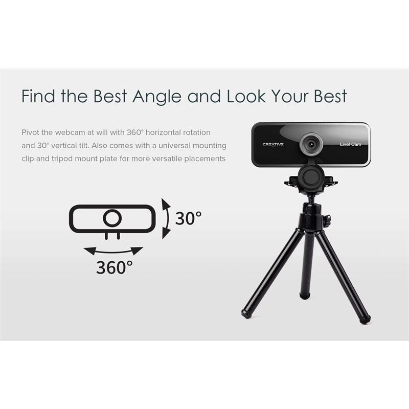 Vídeo panorámico Full HD y un buen aspecto desde cualquier ángulo: Creative Live. Cam Sync 1080p V2 te presenta vídeos Full HD precisos que son fluidos, nítidos y vibrantes. El amplio campo de visión de 77° te permite capturar más de todo con una mínima distorsión óptica, lo que te permite realizar videollamadas cómodamente como grupo. Además, la cámara se puede girar 360° horizontalmente e inclinar 30° verticalmente y se suministra con una pinza de montaje universal
