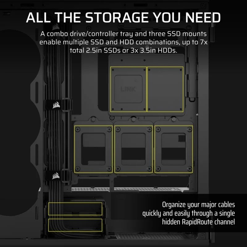 Todo el almacenamiento que necesitas - Dos bandejas combinadas para unidades y tres montajes para SSD permiten múltiples combinaciones de SSD y HDD, hasta 7 SSD de 2.5" o 3 HDD de 3.5".
