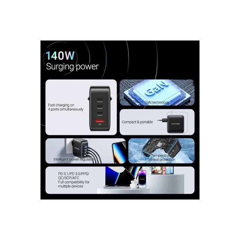 Cargador USB-C Vention de 20W, color negro, compatible con PPS, PD 3.0, QC 3.0 y más, ideal para carga rápida y segura.