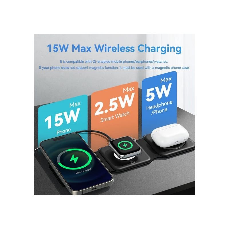 Potencia de carga óptima: Ofrece salida de 15W para el iPhone, 2.5W para el Apple Watch y 3W para los AirPods.
