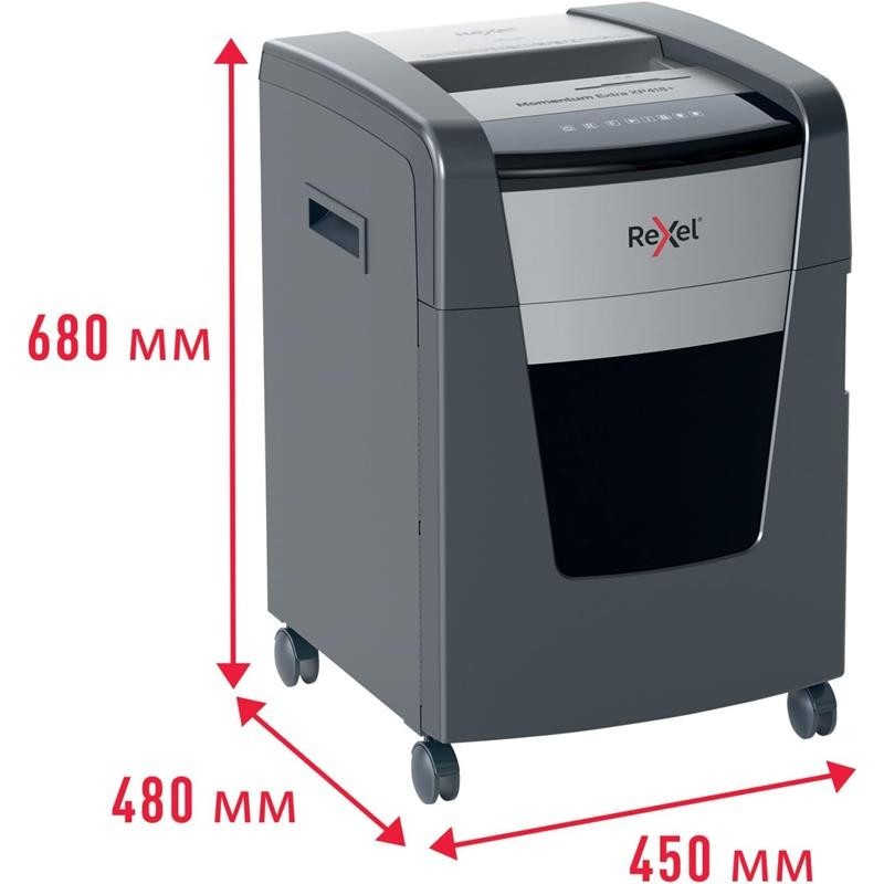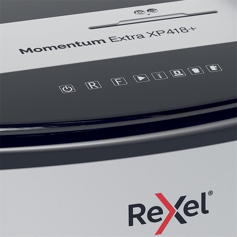 Las destructoras de papel sin atascos Rexel Momentum Extra son ideales para destruir documentos confidenciales en la oficina. La destructora XP418+ destruye hasta 18 hojas de papel A4 (80 grs) de una sola vez a través de la ranura de alimentación manual en partículas P-4 (4x35mm). La tecnología de detección activa mide el número de hojas que se alimentan en tiempo real para detener los atascos y los errores de alimentación del papel; se indica mediante un LED rojo en el panel de control.
