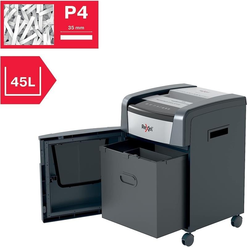 Esta destructora de papel no funcionará hasta que el número de hojas se reduzca por debajo de la capacidad máxima de hojas o la alcance. Esta destructora de corte en partículas está diseñada para un uso moderado o intenso gracias a su gran capacidad de hojas, su gran papelera de 45 litros y su tiempo de funcionamiento continuo. No es necesario quitar primero las grapas y los clips; esta destructora de Rexel también destruye de forma segura CD, DVD y tarjetas de crédito a través de una ranura de alimentación independiente.