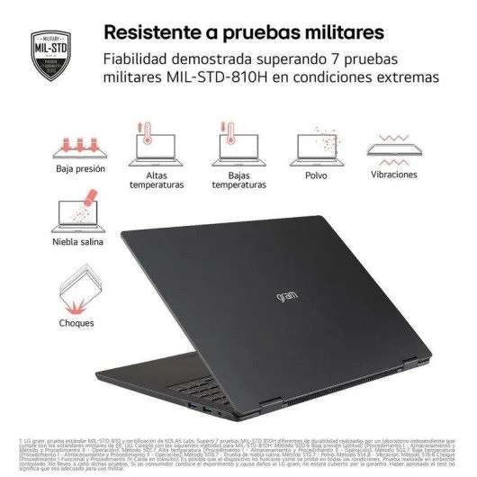 Ligereza extrema y autonomía real. Con solo 1,12 kg y hasta 30 horas de batería, el LG gram 14Z90T redefine la movilidad profesional. Su chasis de magnesio y nano carbono, certificado con estándar militar STD-MIL-810H, garantiza resistencia ante golpes, presión y condiciones adversas, ideal para quienes trabajan en movimiento.