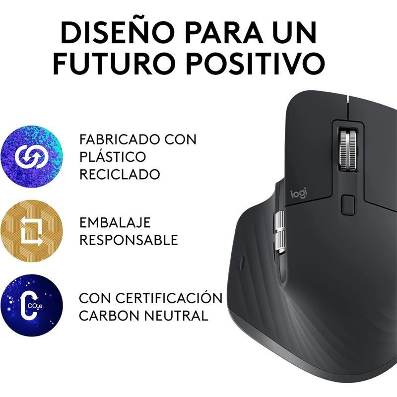 Las piezas de plástico en MX Master 3S incluyen plástico reciclado posconsumo con certificación (grafito y negro: 27%, gris pálido: 22%(10). Con certificación Carbón Neutral.