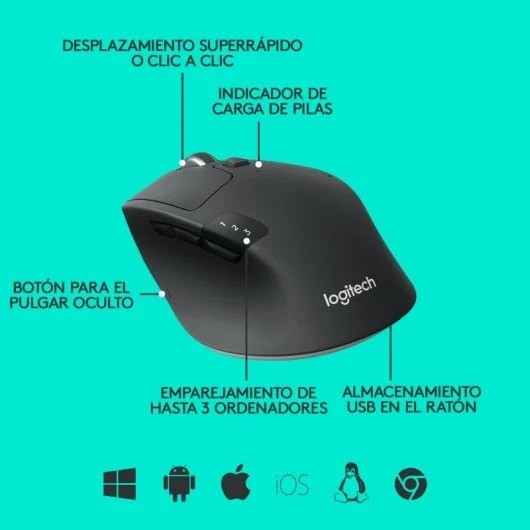 Durable y Versátil: resistente, con una duración de batería de 24 meses(1), el M720 es compatible con ordenadores, portátiles y tablets, con Windows, macOS, Chrome OS, Linux, e iPadOS.