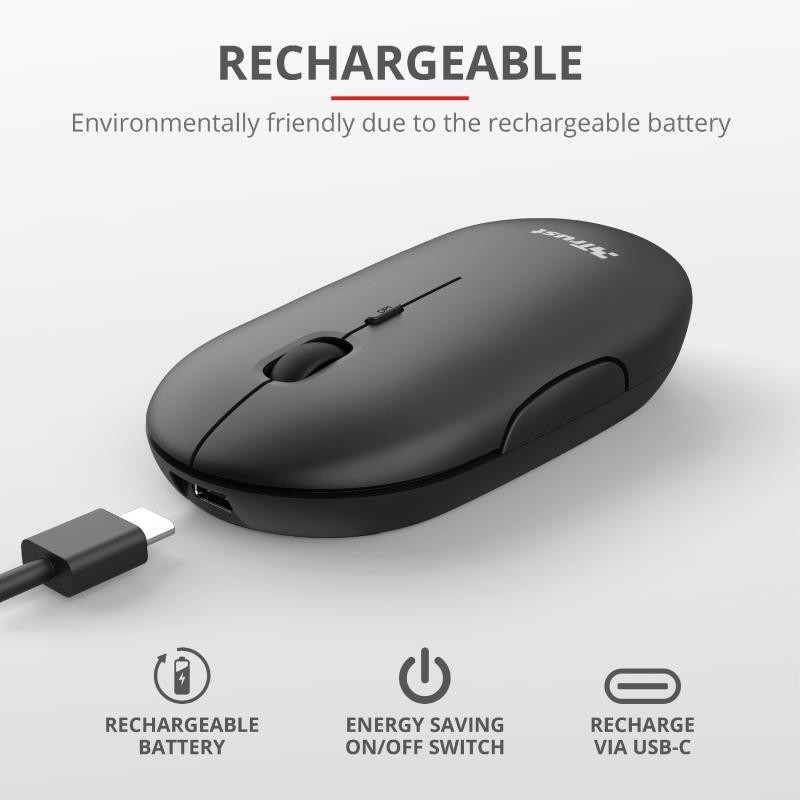 Gracias a la batería recargable, no tendrá que volver a comprar baterías desechables. Cuando el ratón se esté quedando sin batería, simplemente conéctelo con el cable USB-C incluido y listo. Ahorrará dinero y ayudará a proteger el medio ambiente.
