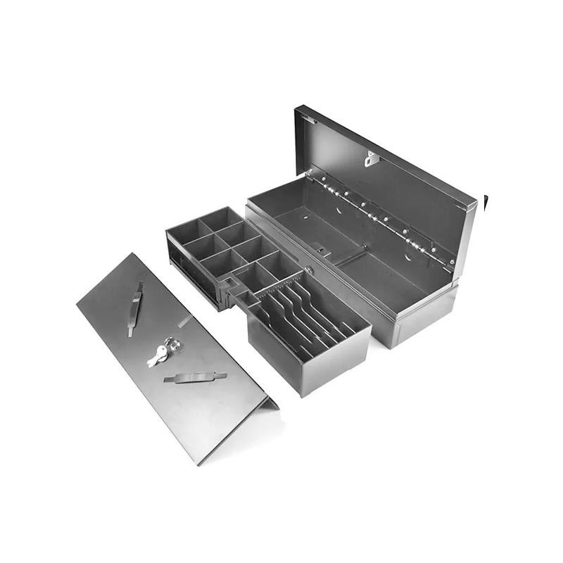 Cajón portamonedas con 6/7 compartimentos ajustables para billetes y 8 fijos para monedas. Cuenta con una cerradura de tres posiciones, carcasa metálica resistente y ranura frontal para transacciones sin efectivo o billetes grandes. Dispone de interfaz RJ12 para impresora de tickets y microswitch. Opcionalmente, incluye una segunda gaveta y tapa con cerradura. Dimensiones: 460 x 170 x 100 mm.